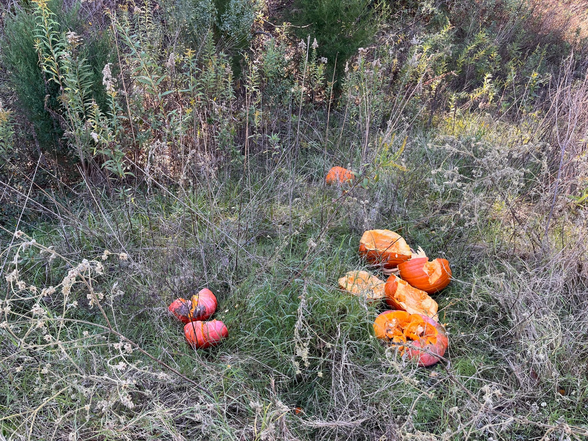 Behind our house is a little walking trail. It’s mostly a straight shot downhill, surrounded on either side by some oaks, cedars, cypress, and of course towering pine trees. It leads to a clearing, which branches off to several other walking trails, some back to my neighborhood, some out to a public park not too far away. It’s overgrown in spots, mostly unmaintained throughout, and it’s somewhere on these trails that we’ll drop these pumpkins off in a heap on the ground, to finish their rotting and return from whence they came.