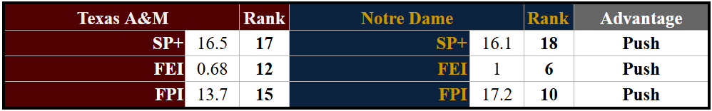 It's a weird deal with the Ags having played two games against relatively easy competition, and the only game Notre Dame has played was against a Top 30 Miami team. I think the two big questions for the Aggies are 1. Can their explosiveness on offense continue against a defense that mostly managed to keep a dangerous Canes offense in check and 2. Will their run game defense be able to hold up against a Notre Dame backfield with a couple of homerun threats.